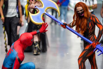 2021 NY Comic Con-Day 2 Costumed attendees mock fight during New York Comic Con at the Jacob K. Javits Convention Center on Friday, Oct. 8, 2021, in New York. (Photo by Charles Sykes/Invision/AP) (Charles Sykes/Charles Sykes/Invision/AP)
