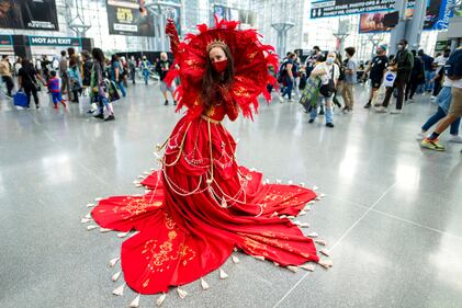 2021 NY Comic Con-Day 2 A costumed attendee poses during New York Comic Con at the Jacob K. Javits Convention Center on Friday, Oct. 8, 2021, in New York. (Photo by Charles Sykes/Invision/AP) (Charles Sykes/Charles Sykes/Invision/AP)