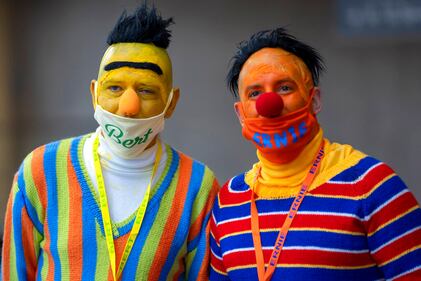 2021 NY Comic Con-Day 2 Attendees dressed as Bert and Ernie from "Sesame Street" pose during New York Comic Con at the Jacob K. Javits Convention Center on Friday, Oct. 8, 2021, in New York. (Photo by Charles Sykes/Invision/AP) (Charles Sykes/Charles Sykes/Invision/AP)