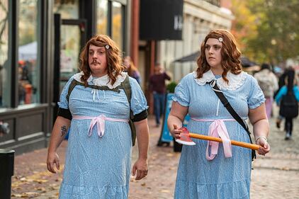 Halloween Costumed revelers dressed as the twins Alexa and Alexie from the movie The Shinning, celebrate Halloween Eve in Salem, Massachusetts on October 30, 2024. (Photo by Joseph Prezioso / AFP) (Photo by JOSEPH PREZIOSO/AFP via Getty Images) (JOSEPH PREZIOSO/AFP via Getty Images)