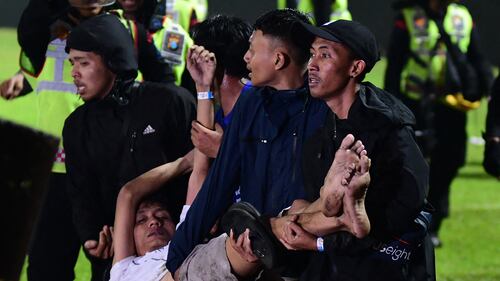 INDONESIA-FBL-UNREST-STAMPEDE In this picture taken on October 1, 2022, a group of people carry a man at Kanjuruhan stadium in Malang, East Java. - At least 127 people died at a football stadium in Indonesia late on October 1 when fans invaded the pitch and police responded with tear gas, triggering a stampede, officials said. (STR/AFP via Getty Images)