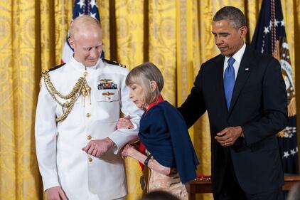 Photos: Joan Didion through the years WASHINGTON, DC - JULY 10: U.S. President Barack Obama (R) helps as author Joan Didion (C) is escorted from the stage after being presented a 2012 National Humanities Medal during a ceremony in the East Room of the White House on July 10, 2013 in Washington, DC. Didion is recognized for her mastery of style in writing. (Photo by Pete Marovich/Getty Images) (Pete Marovich/Getty Images)
