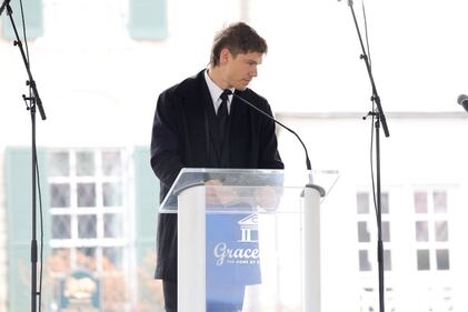 Lisa Marie Presley memorial service: Ben Smith-Petersen reads a tribute by Riley Keough, Lisa Marie Presley's daughter, at the public memorial for Lisa Marie Presley at Graceland. (Jason Kempin/Getty Images)