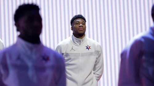NBA All-Star Game Giannis Antetokounmpo of the Milwaukee Bucks is introduced before the NBA All-Star basketball game Sunday, Feb. 16, 2020, in Chicago. (Nam Huh/AP)