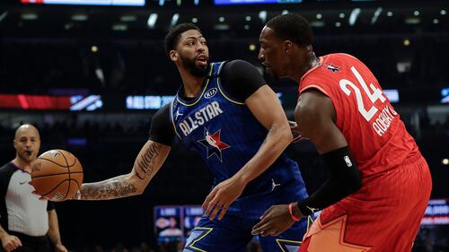 NBA All-Star Game 2020 Anthony Davis of the Los Angeles Lakers looks to pass around Bam Adebayo of the Miami Heat during the second half of the NBA All-Star basketball game Sunday, Feb. 16, 2020, in Chicago. (Nam Huh/AP)