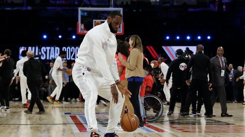 NBA All-Star Game LeBron James of the Los Angeles Lakers warms up before the NBA All-Star basketball game Sunday, Feb. 16, 2020, in Chicago. (Nam Huh/AP)