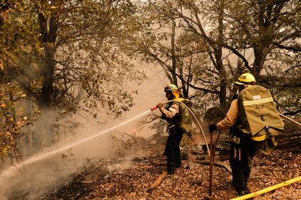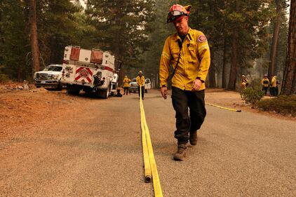 Photos: No containment, new threats from California's Caldor Fire Firefighters roll up a forestry hose during the Caldor Fire in Kyburz, California, U.S., on Sunday, Aug. 22, 2021. The fire, which has scorched 82,444 acres since sparking last week, crossed Highway 50 on Saturday with the help of increased wind activity. (David Odisho/Bloomberg via Getty Images)