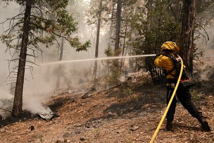 Photos: No containment, new threats from California's Caldor Fire A firefighter prepares to battle an active fire on a hillside during the Caldor Fire in Kyburz, California, U.S., on Sunday, Aug. 22, 2021. The fire, which has scorched 82,444 acres since sparking last week, crossed Highway 50 on Saturday with the help of increased wind activity. (David Odisho/Bloomberg via Getty Images)