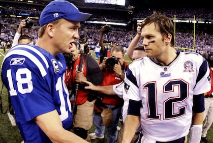 Through the years INDIANAPOLIS - NOVEMBER 15: Quarterback Peyton Manning #18 of the Indianapolis Colts greets Tom Brady #12 of the New England Patriots after the game at Lucas Oil Stadium on November 15, 2009 in Indianapolis, Indiana. The Colts won the game 35-34. (Photo by Jamie Squire/Getty Images) (Jamie Squire/Getty Images)