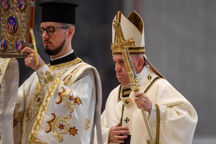 Easter Mass Pope Francis, right, arrives to celebrate Easter Sunday Mass, inside an empty St. Peter's Basilica at the Vatican, Sunday, April 12, 2020. (Andreas Solaro/Pool via AP)
