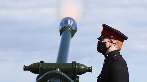 Prince Philip honored with 41-gun salutes Members of the 105th Regiment Royal Artillery fire a 41-round gun salute at Edinburgh Castle, to mark the death of Prince Philip, in Edinburgh, Saturday, April 10, 2021. Britain's Prince Philip, the irascible and tough-minded husband of Queen Elizabeth II who spent more than seven decades supporting his wife in a role that mostly defined his life, died on Friday. (Andrew Milligan/PA via AP) (Andrew Milligan/AP)