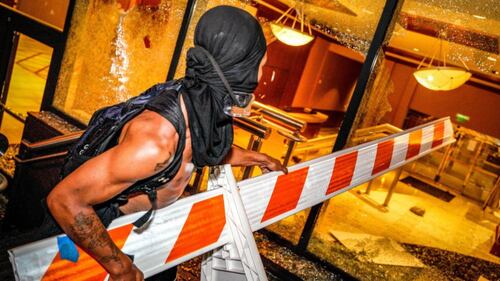 George Floyd's death A man breaks a window at the CNN Center in Atlanta during Friday night's protest. (Ben Hendren/Anadolu Agency via Getty Images)