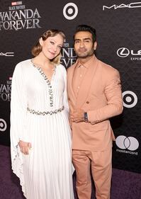 Photos: Rihanna, other stars shine on 'Black Panther: Wakanda Forever' red carpet Emily V. Gordon and Kumail Nanjiani attend the "Black Panther: Wakanda Forever" World Premiere at the El Capitan Theatre in Hollywood, California, on October 26, 2022. (Jesse Grant/Getty Images for Disney)