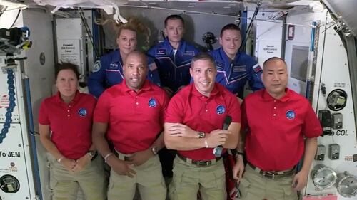 Photos: SpaceX capsule with 4 astronauts reaches International Space Station In this frame grab from NASA TV, SpaceX Dragon crew, from front left to right, Shannon Walker, Victor Glover, Mike Hopkins and Soichi Noguchi stand with International Space Station crew Kate Rubins, from back left, Expedition 64 commander Sergey Ryzhikov and Sergey Kud-Sverchkov during a welcome ceremony, early Tuesday, Nov. 17, 2020. The Dragon arrived and docked at the ISS late Monday. (NASA TV via AP)