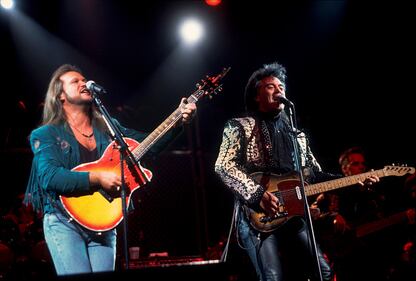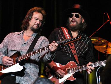 Travis Tritt ATLANTA circa 1992: Gary Rossington (hat) of Lynyrd Skynyrd joins Travis Tritt on stage at The Omni Coliseum in Atlanta, Ga. circa 1992 (Photo by Rick Diamond/Getty Images) (Rick Diamond/Getty Images)