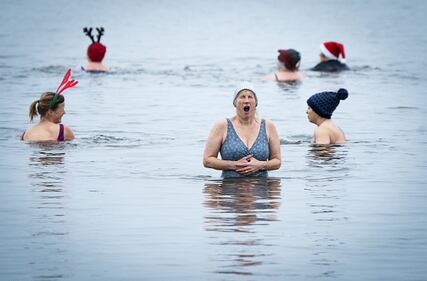 Winter Solstice 2021 People take part in a winter solstice swim at Portobello Beach in Edinburgh to mark the solstice and to witness the dawn after the longest night of the year. Picture date: Tuesday December 21, 2021. (Photo by Jane Barlow/PA Images via Getty Images) (Jane Barlow - PA Images/PA Images via Getty Images)