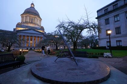 Winter Solstice 2021 People walk past the sundial near the Legislative Building just before dusk, Tuesday, Dec. 21, 2021, at the Capitol in Olympia, Wash. Tuesday was Winter Solstice and the shortest day of the year. Although it wasn't visible in the sky, the sun set just before 4:30 p.m. Tuesday. (AP Photo/Ted S. Warren) (Ted S. Warren/AP)