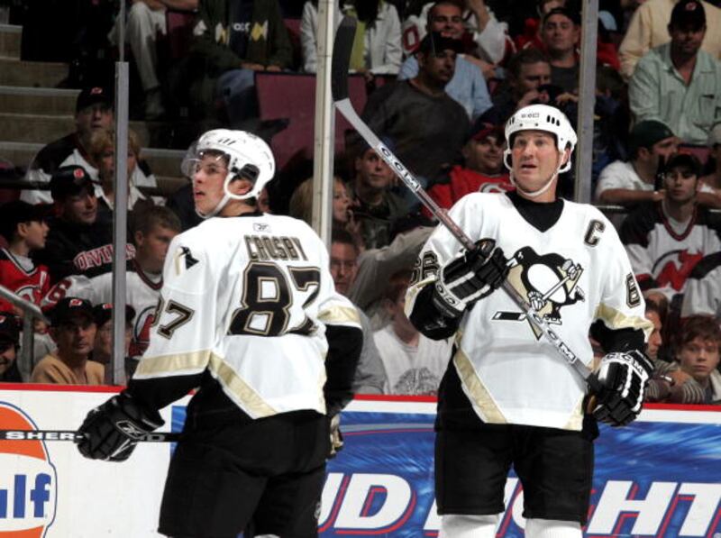 Through the years Pittsburgh Penguins Sidney Crosby #87 looks on during warmups with Mario Lemieux #66 before a NHL pre season game against the Columbus Blue Jackets at Mellon Arena on September 27, 2005 in Pittsburgh, Pennsylvania. (Photo By Gregory Shamus/Getty Images) (Gregory Shamus/Getty Images)