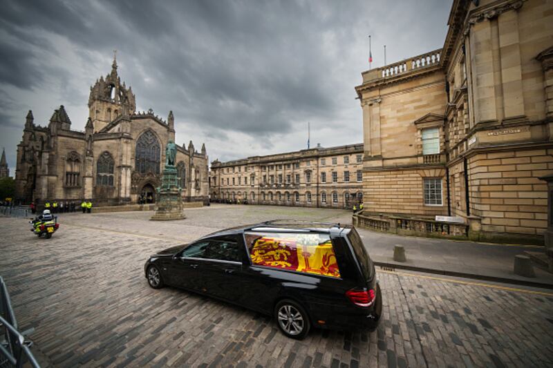 Photos: Queen Elizabeth II's coffin leaves Balmoral, arrives in Edinburgh The hearse carrying the coffin of Queen Elizabeth II arrives at Palace of Holyroodhouse, Edinburgh, where she will lie overnight and then be moved to St Giles Catherdral on September 11, 2022, in Edinburgh, United Kingdom. (Lisa Ferguson - WPA Pool/Getty Images)