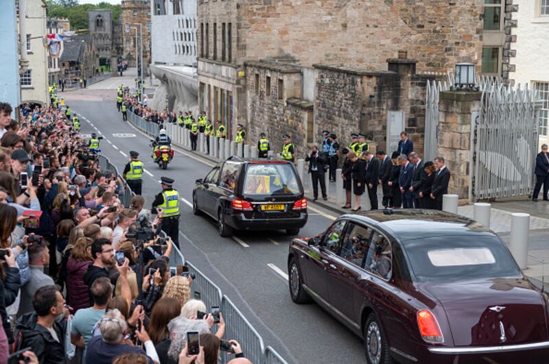 Photos: Queen Elizabeth II's coffin leaves Balmoral, arrives in Edinburgh People gather on the Royal Mile, Edinburgh to watch the cortege carrying the coffin of the late Queen Elizabeth II, draped with the Royal Standard of Scotland, as it completes its journey from Balmoral to the Palace of Holyroodhouse on September 11, 2022, in Edinburgh, United Kingdom. (Jamie Williamson/WPA Pool/Getty Images)