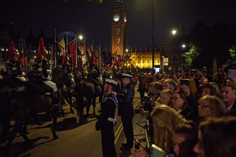 Photos: Queen Elizabeth II lies in state as thousands wait through night to pay respects A crowd looks on as soldiers march through Parliament Square during a rehearsal on September 15, 2022, for Queen Elizabeth II's funeral in London. (Alex McBride/Getty Images)