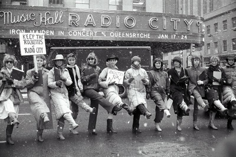 Radio City Rockettes The Rockettes, bundled in warm winter coats and hats, demonstrate in front of Radio City Music Hall during a winter snowfall. Their show will come to an end after fifty years of continuous performances at Radio City Music Hall. (Bettmann/Bettmann Archive)