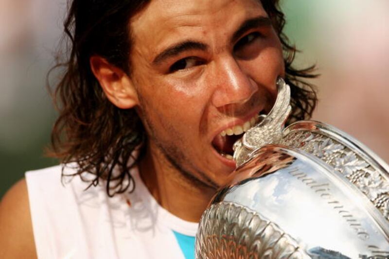 Photos: Rafael Nadal through the years 2007: Rafael Nadal of Spain bites the Philippe Chatrier Trophy after winning against Roger Federer of Switzerland in the Men's Singles Final on Day 15 of the French Open at Roland Garros on June 10, 2007, in Paris. (Clive Brunskill/Getty Images)