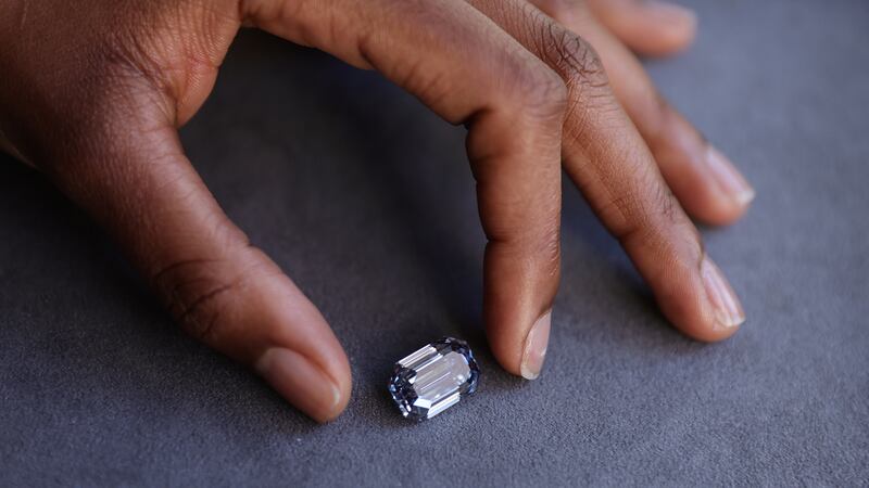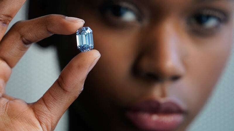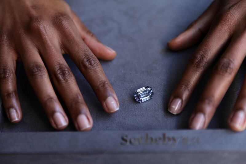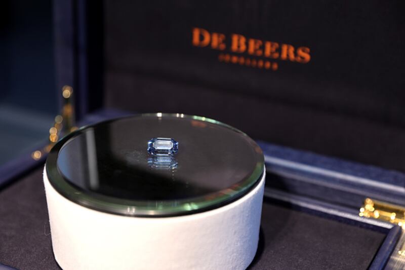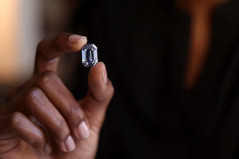 Photos: Rare 15.1-carat blue diamond fetches nearly $57.5M at auction NEW YORK, NEW YORK - FEBRUARY 15: The De Beers Cullinan Blue diamond is shown before being auctioned at Sotheby's on February 15, 2022 in New York City. The blue diamond is the largest and most valuable to appear at auction. (Photo by Michael Loccisano/Getty Images) (Michael Loccisano/Getty Images)