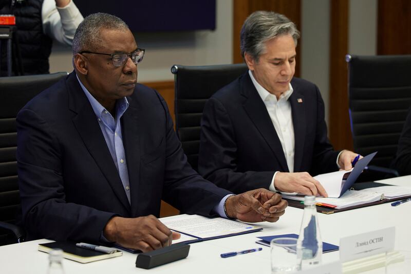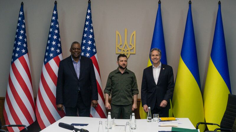 Photos: Top US officials meet Ukrainian president in Kyiv Secretary of State Antony Blinken and Secretary of Defense Lloyd Austin talk after speaking with reporters Monday, April 25, 2022, in Poland, near the Ukraine border, after returning from their trip to Kyiv, Ukraine, and meeting with Ukrainian President Volodymyr Zelenskyy. (AP Photo/Alex Brandon, Pool)