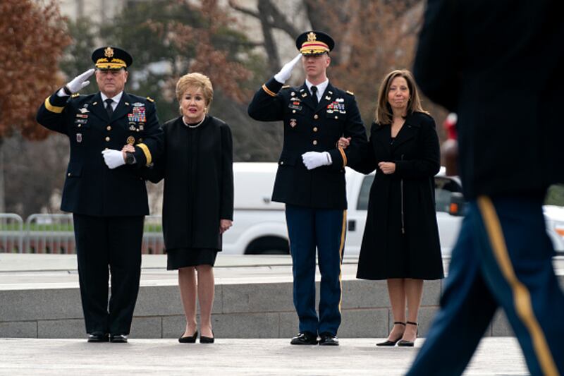 Sen. Bob Dole funeral Elizabeth Dole accompanied with Joint Chiefs of Staff Chairman Marine General Mark Milley and Robin Dole watch a military honor guard carries the casket of Sen. Bob Dole (R-KS) is seen in a hearse after lying in state at the U.S. Capitol on December 10, 2021 in Washington, DC. Dole, a veteran who was severely injured in World War II, was a Republican Senator from Kansas from 1969 to 1996. He ran for president three times and became the Republican nominee for president in 1996. (Photo by Pool/Getty Images) (Greg Nash/Getty Images)