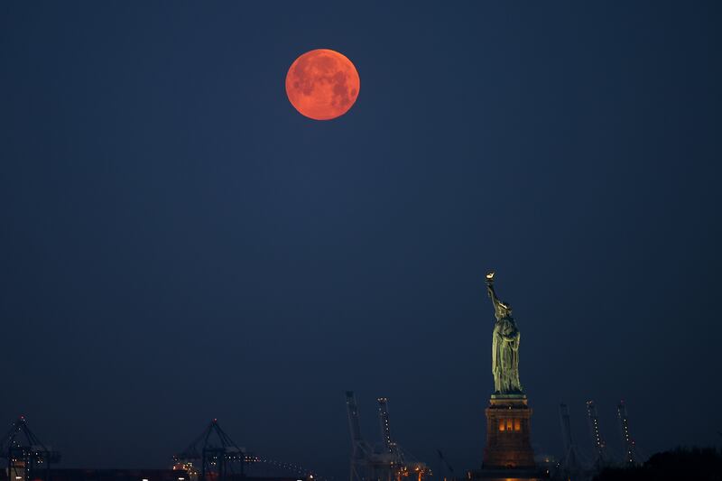 Photos: Super Flower Blood Moon 2021 delights skygazers, coincides with lunar eclipse The full moon sets behind the Statue of Liberty in New York City, United States, on May 26, 2021. (Tayfun Coskun/Anadolu Agency via Getty Images)