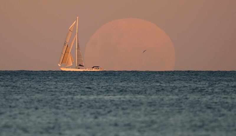 Photos: Super Flower Blood Moon 2021 delights skygazers, coincides with lunar eclipse A yacht sails past as the moon rises in Sydney Wednesday, May 26, 2021. A total lunar eclipse, also known as a Super Blood Moon, will take place later tonight as the moon appears slightly reddish-orange in colour. (AP Photo/Mark Baker)