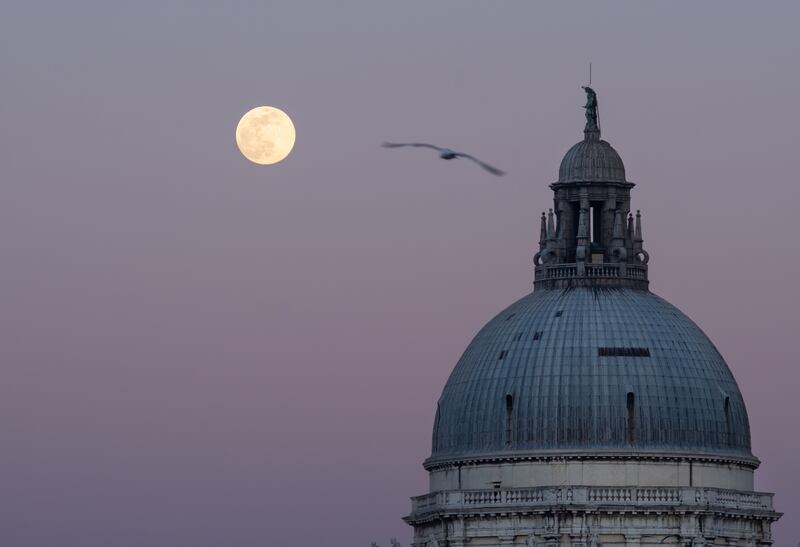 Super pink moon The supermoon rises over the Santa Maria della Salute church during the lockdown of the city on April 7, 2020, in Venice, Italy. (Simone Padovani/Awakening/Getty Images)