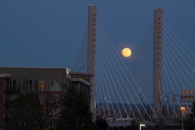 Super pink moon The so-called pink supermoon rises above the Highway 509 bridge over the Thea Foss Waterway, Tuesday, April 7, 2020, in Tacoma, Wash. (AP Photo/Ted S. Warren)