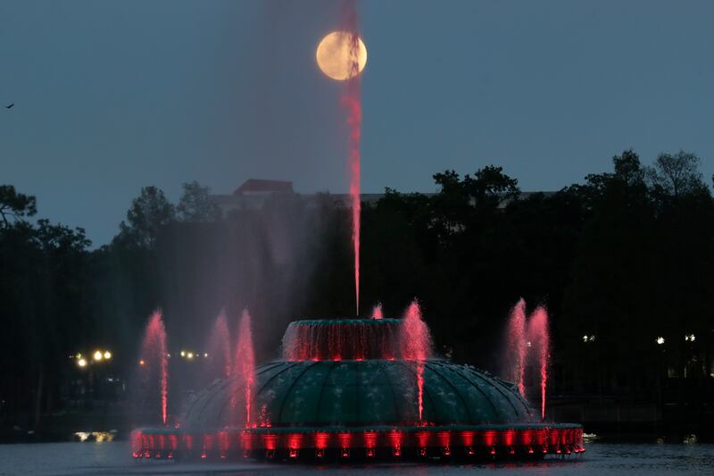 Super pink moon The super moon rises in the sky in front of a fountain a Lake Eola on Tuesday, April 7, 2020, in Orlando, Fla. (AP Photo/John Raoux)