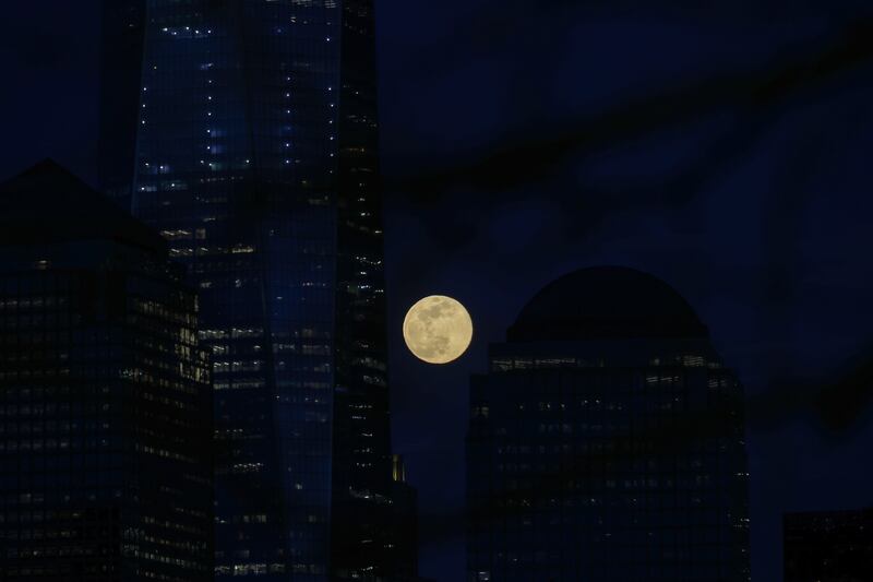 Super pink moon The super pink moon rises behind the Empire State Building in New York City lit to honor COVID-19 health care workers on April 7, 2020, as seen from Union City, New Jersey. (Gary Hershorn/Getty Images)