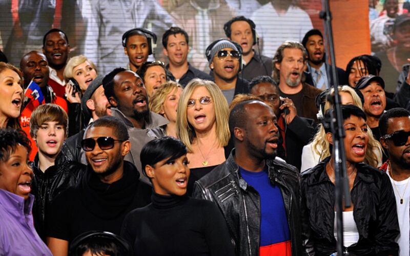 Through the years HOLLYWOOD - FEBRUARY 01: In this handout photo provided by WATW, singers Celine Dion, Justin Bieber, Usher, Katharine McPhee, will.i.am, Toni Braxton, Barbra Streisand, LL Cool J, Harry Connick Jr., Wyclef Jean, Vince Vaughn, Jeff Bridges, Natalie Cole and others perform at the "We Are The World 25 Years for Haiti" recording session held at Jim Henson Studios on February 1, 2010 in Hollywood, California. (Photo by Kevin Mazur/Handout) (Handout/Getty Images)