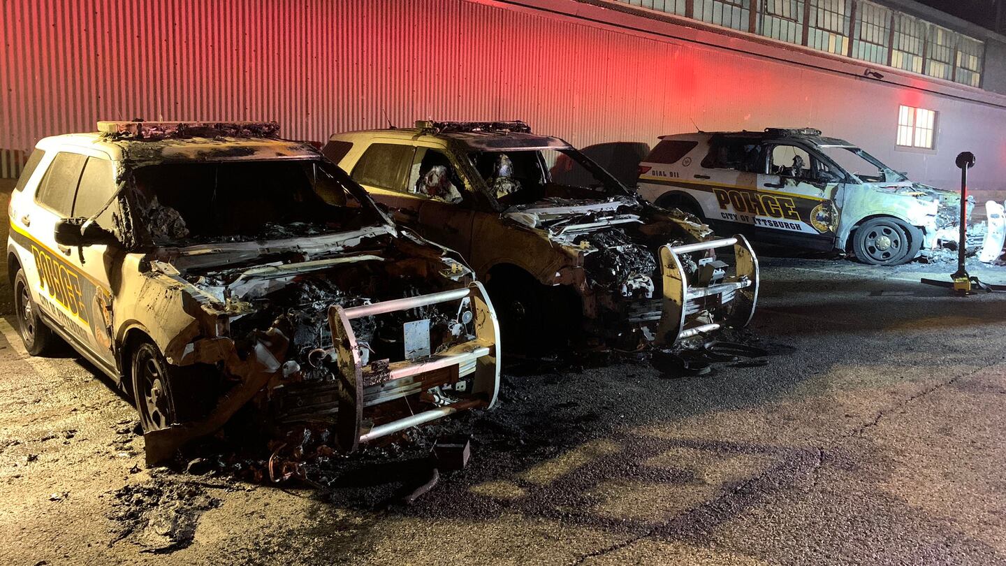 A photo shared by Pittsburgh Public Safety in a news release shows the vehicles were damaged beyond repair. Investigators said in the news release that the cruisers were found engulfed in flames just after 2:30 a.m. Wednesday.