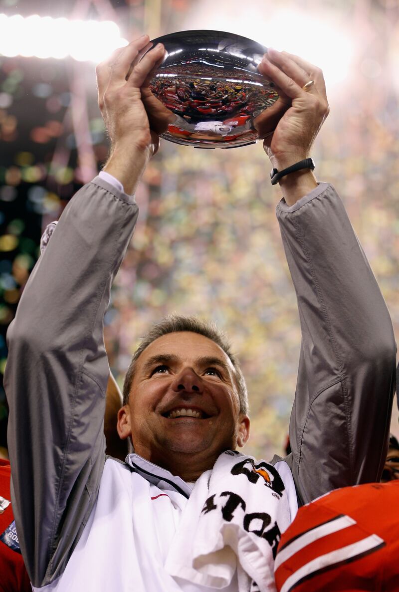 Photos: Urban Meyer through the years 2015: Head coach Urban Meyer of the Ohio State Buckeyes hoists the trophy after defeating the Oregon Ducks 42-20 in the College Football Playoff National Championship Game at AT&T Stadium on January 12, 2015, in Arlington, Texas. (Jamie Squire/Getty Images)