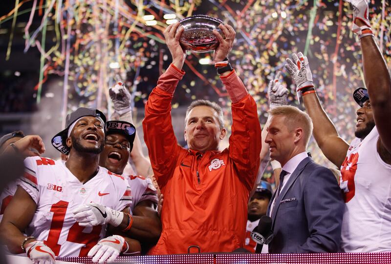 Photos: Urban Meyer through the years 2017: Head coach Urban Meyer of the Ohio State Buckeyes celebrates with the trophy after their 27-21 win over the Wisconsin Badgers during the Big Ten Championship game at Lucas Oil Stadium on December 2, 2017, in Indianapolis. (Joe Robbins/Getty Images)