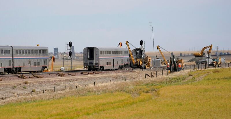 Amtrak derailment Heavy equipment moves gravel Sunday, Sept. 26, 2021, next to cars from an Amtrak train that derailed the day before just west of Joplin, Mont., killing three people and injuring others. The westbound Empire Builder was en route to Seattle from Chicago, with two locomotives and 10 cars. (AP Photo/Ted S. Warren) (Ted S. Warren/AP)