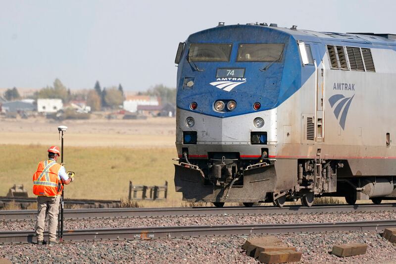 Amtrak derailment A person uses survey equipment, Sunday, Sept. 26, 2021, near an Amtrak train that derailed Saturday just west of Joplin, Mont. The westbound Empire Builder was en route to Seattle from Chicago, with two locomotives and 10 cars. (AP Photo/Ted S. Warren) (Ted S. Warren/AP)