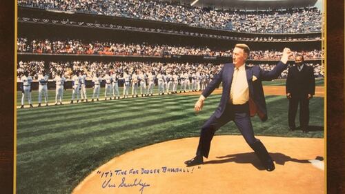 Vin Scully collection Vin Scully throws out the first pitch at Dodger Stadium, with the broadcaster's autograph at the bottom of the image. (Hunt Auctions)