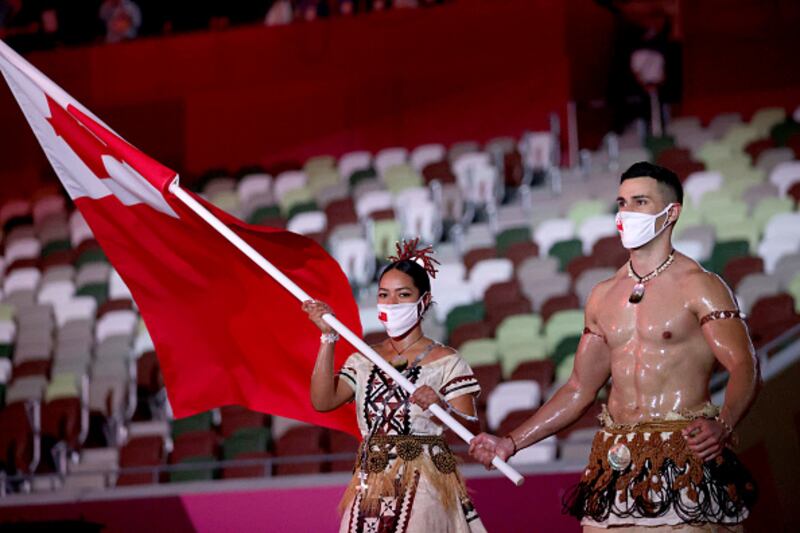Through the years Flag bearers Malia Paseka and Pita Taufatofua of Team Tonga lead their team during the Opening Ceremony of the Tokyo 2020 Olympic Games at Olympic Stadium on July 23, 2021 in Tokyo, Japan. (Photo by Hannah McKay - Pool/Getty Images) (HANNAH MCKAY/Getty Images)
