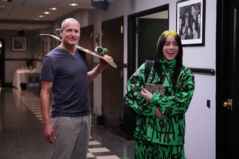 Woody Harrelson SATURDAY NIGHT LIVE -- "Woody Harrelson" Episode 1768 -- Pictured: (l-r) Host Woody Harrelson and musical guest Billie Eilish during promos in Studio 8H on September 24, 2019 -- (Photo by: Rosalind O'Connor/NBCU Photo Bank/NBCUniversal via Getty Images via Getty Images) (NBC/NBCU Photo Bank/NBCUniversal via)