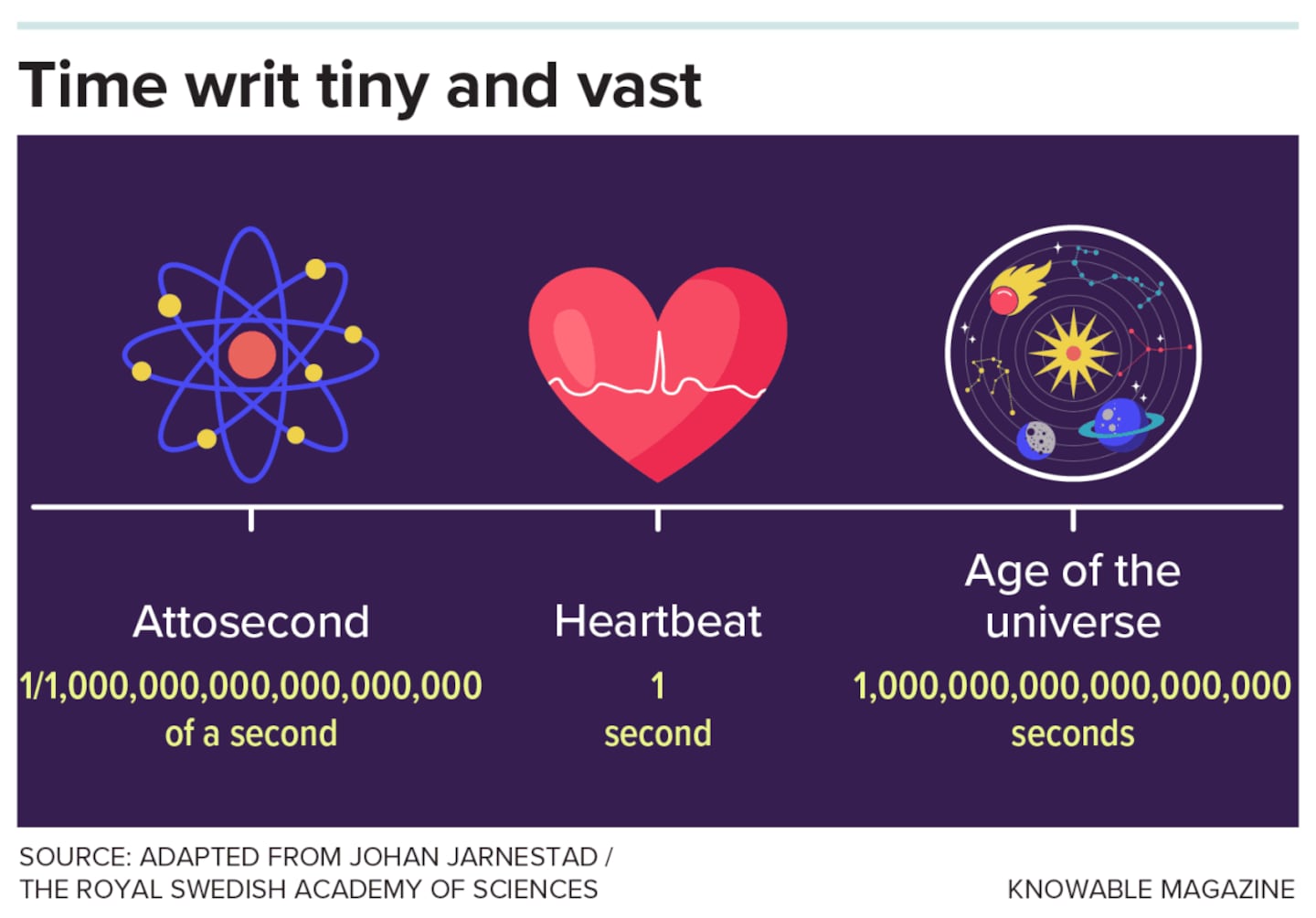 Knowable Magazine welcomes you to the world of a cadre of scientists, some of them Nobel Prize winners, who live in the fastest science lane possible right now — the realm of attoseconds. By leveraging the evolution of laser science and technology, they have trained their attention on molecular, atomic and electronic behavior of ever finer temporal durations — from millionths (micro) to billionths (nano) to trillionths (pico) to quadrillionths (femto) to quintillionths (atto) of seconds.
