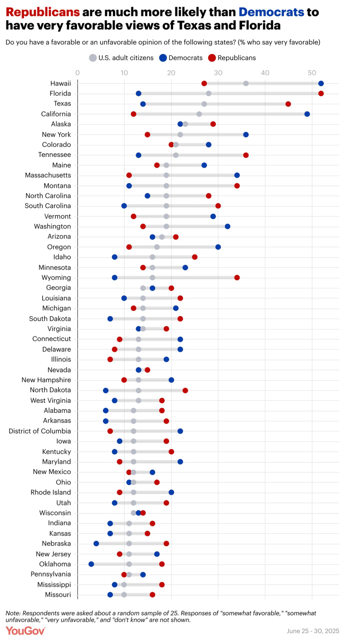 Hawaii is America's favorite state in 2025, according to a new YouGov survey that asked 2,000+ Americans which states they view most and least favorably. Meanwhile, fewer Americans have a favorable view of Washington, D.C. than of any state.