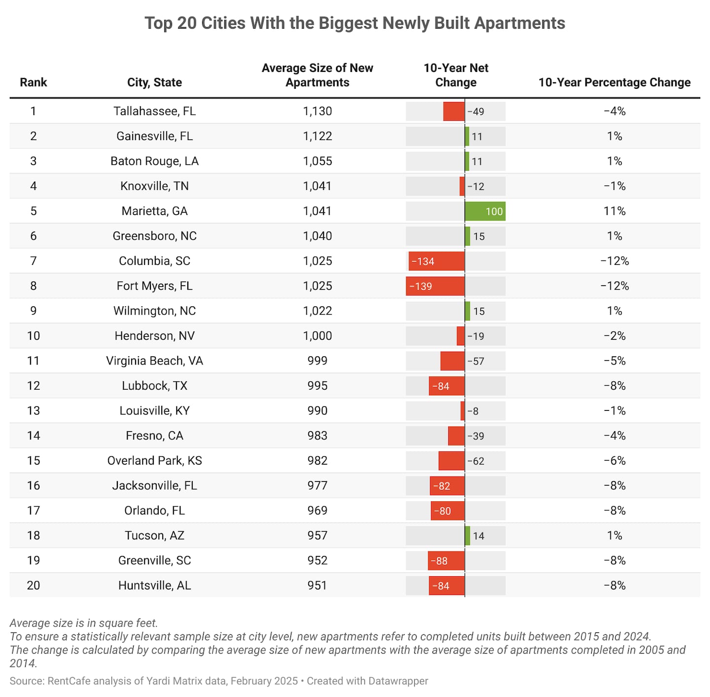 Southern destinations offer the most generous apartment sizes, giving renters additional breathing room. Among 100 cities surveyed, Tallahassee, Florida, tops the list, with new apartments built in the past decade averaging 1,130 square feet.