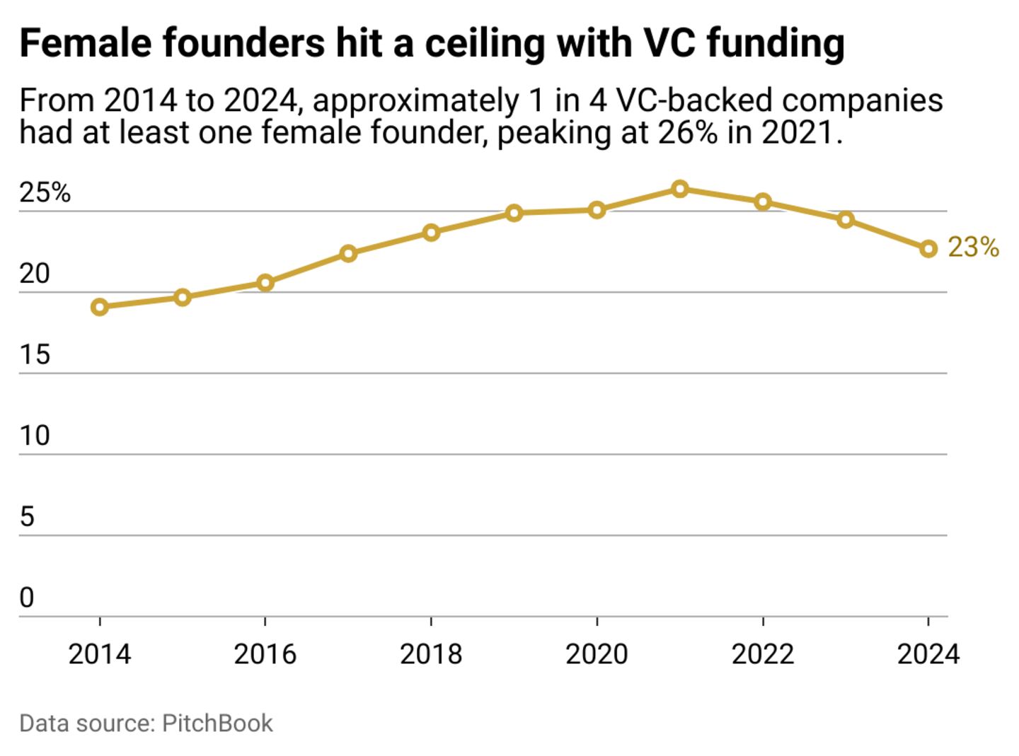 While women founders have made significant gains in the last 10 years, funding distribution still hasn't achieved parity. After 2021, funding toward those startups with at least one woman founder dwindled from 26% to 23%.