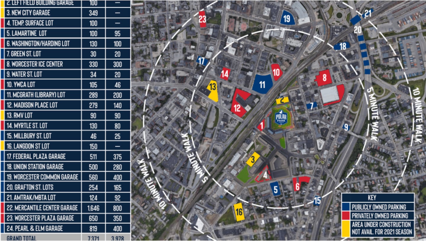 The Woo Sox say there are at least 24 known parking lots or garages available to fans within a half mile walking radius of Polar Park, with more than 7,300 total parking spaces in that area.